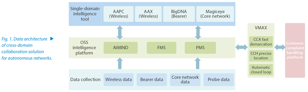 ZTE’s uSmartNet full-domain autonomous network solution, built on its big data product VMAX, establishes seamless connectivity between various individual domains through relevant standard interfaces. It retrieves relevant configuration, alarm, and performance data from wireless, bearer, and core networks. Through the analysis and processing of big data, it intelligently analyzes and precisely locates problems, ranging from individual call detail records to the entire network. Moreover, VMAX extends its capabilities and interconnects intelligent tools from different domains through the OpenAPI interface. Leveraging intelligent core algorithms, this approach addresses the challenge of diverse protocols and characteristics in individual domains, which previously hindered collaborative efforts. By taking a multi-layered approach that encompasses native network elements, single-domain automation, and cross-domain collaboration, it enables automatic closed-loop of full-domain network automation and problem handling (Fig 八戒影视. 1).