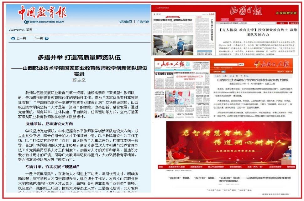 深耕四载, 收获满满。一是强化师德师风建设, 铸造团队精神风范。团队成员1人获评 “职业教育突出贡献奖”,1 人入选教育部“新时代职业教育名师(名匠)名校长培养计划”,累计 21 人次被评为中国电子教育学会职教名师、山西省教学名师、山西省模范教师、校级优秀教师;建设省级特色文化育人品牌2个、省级思政微课6门。二是搭建多元发展平台 拓宽教师成长通道。建设山西省职业教育中高职衔接专业教师协同研修“双师型”名师工作室、信创匠心思政教育工作室、电子信息职业教育“双师型名师”工作室、紧缺领域教师技术技能传承平台等能力提升研修平台。建成国家级职业教育“双师型”教师培训基地、山西省首批产教融合重大平台载体和实训基地、华为 5G+数字化人才产教融合基地、山西省现代信息通信技术实训基地、山西省大数据科技创新中心、山西省职业学校大数据特色产业学院等技术技能创新平台。联合政行企校,参与建设新一代信息技术等 15 个全国行业产教融合共同体。以平台为载体,不断强化校企供需对接,推动技术开发与科研成果转化,为团队教师的“双师”能力提升提供了强有力的支撑与保障。三是打造结构化教师团队,职业能力稳步提升。团队成员具有高级职称 14 人,占 70%,较建设初期增长了 30%;具有高级职业资格 12 人,占 60%,较建设初期增长了20%;团队双师比例达到100%,较建设初期增长了 20%。四是措施得当多点发力,团队建设成效显著。建设在线精品开放课程国家级2门、省级4门;职教金课省级2门,院级3门;教学资源库省级1个,院级3个;出版教材国规5部、省规3部、校本10部;获得省级教学成果奖2项;教师参加技能竞赛获得省级以上奖项7项;指导学生参加各类技能大赛共获得国家级奖项22项、省级奖项42项;主持国家级科研项目5项、省级13项;发表高水平论文SCI 5篇、EI 1篇、中文核心期刊8篇;获得专利软著6项;开发国际职业标准3项;为企业开展技术服务8项,累计到账263,8万元。五是校校多元协同,建设协作共同体。建立“团队共建、项目共研、成果共享”的协作机制,为校校、校企深度高效协同提供保障。与扬州大学国培基地、天津职业技术大学等14所职业院校组成新一代信息技术(三)协作共同体;与深圳职业技术大学等 11 所院校共同承担教育部新一代信息技术领域职业教育课程改革试点项目(“101 计 划”)工作,主持建设课程 1 门,参与建设课程 9 门;与武汉职业技术学院共建国家级职业教育“双师型”教师培训基地(电子与信息大类),实现教师共培; 与天津职业大学等院校共建鲁班工坊电子信息大类——物联网应用技术专业双语教学资源库;开展“慕课西行” 活动,实现资源共享;以两个国家级课题研究为载体,参加共同体课题研讨会16场,实现成果共研。六是深化教学改革,探索模块化课程和教学。以立德树人为根本,针对不同岗位群任职要求,智育融入思维训练,体育融入工程实践,美育融入职业规范,劳育融入劳动教育,实现岗标融合;坚持以培养职业能力为核心,以职业岗位为导向,对接职业标准,校企协同采用“五步构建法”开发课程模块,形成了“宽平台-辅岗位-主岗位-辅岗位”的课程体系地图,评价主体多元,评价过程全面,评价结果优良。七是特色创新评价高,示范引领树标杆。团队建设范式《“双主体”构建 “双平台”赋能 “五任务”驱动建设国家级教师教学创新团队》入选教育部职业教育教师队伍典型工作案例;《中国教育报》、《山西日报》、山西卫视等多家主流媒体对团队建设情况进行了深度报道;团队成员受邀作报告10余场,参加山西省优秀教师事迹展播;毕业生成长案例入选教育部《职引未来》全国首批职教案例;先后为20余所省内兄弟院校提供技能大赛赛前技术培训等服务。 八戒影视高清。
