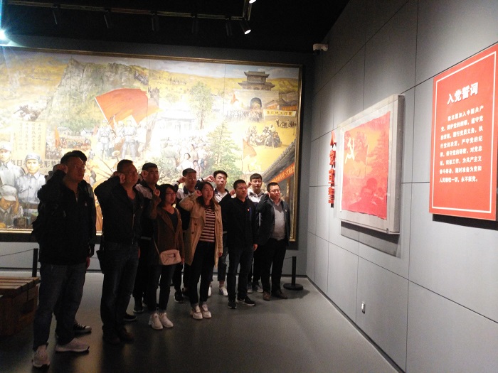 在表现晋中地区抗战历史的《热土风云》展厅 八戒影视在线,教工支部和学生支部的党员分别面向党旗进行了庄严的重温入党誓词宣誓活动,学生支部书记张晓波为新入党的5名学生党员佩戴了党徽。